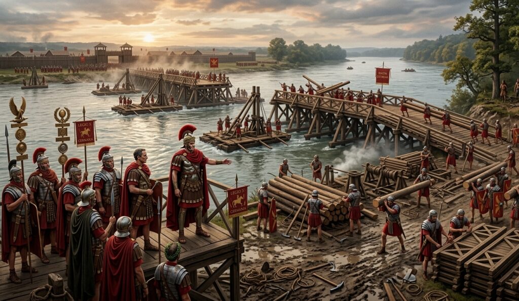 By 55 BCE, Caesar had grown bolder. Germanic tribes across the Rhine were raiding into Gaul. Instead of waiting, Caesar decided to teach them a lesson—Roman style.